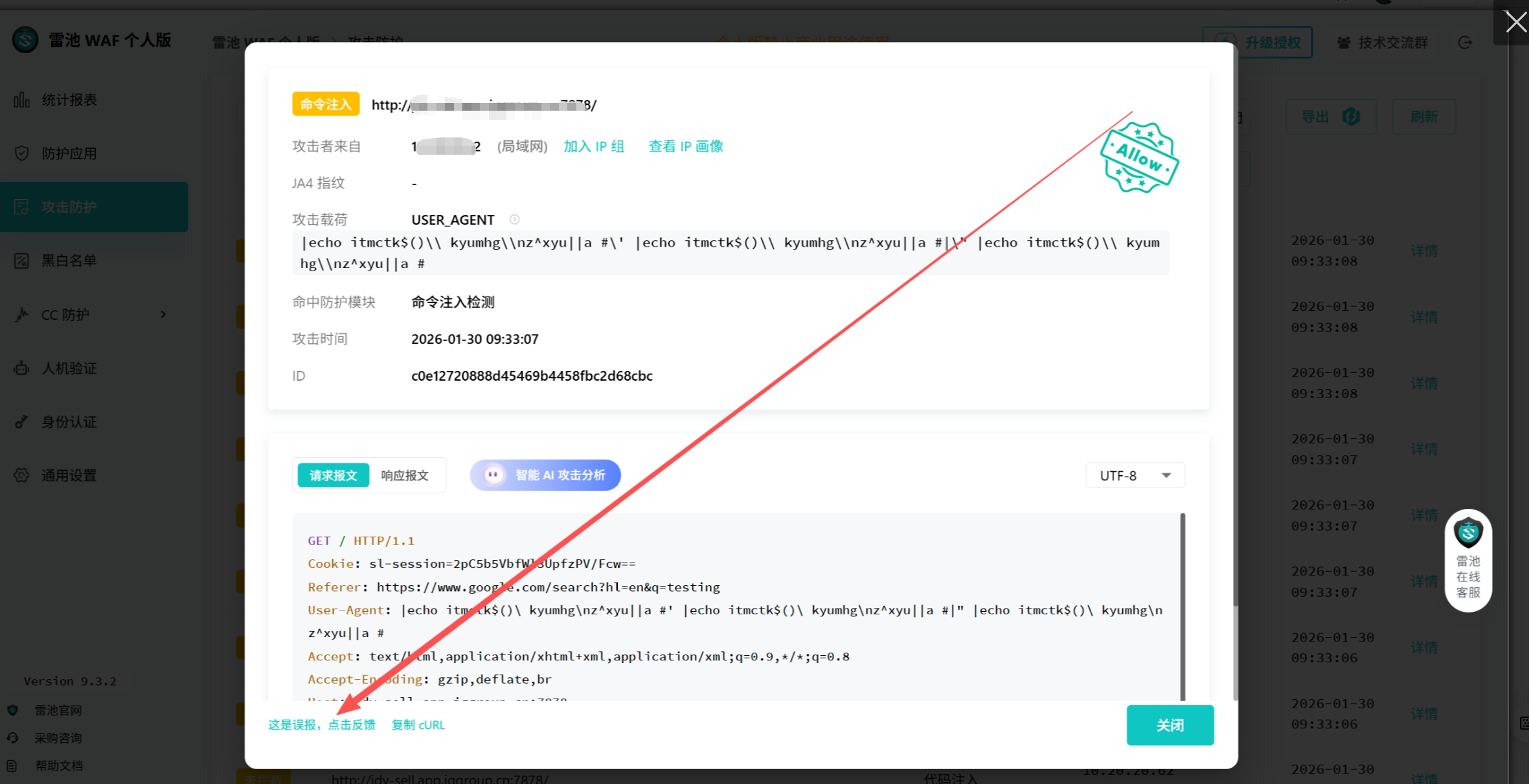 - 进入「日志中心→攻击日志」,定期查看拦截日志,针对业务正常请求的误拦截记录,点击「加白」,快速添加 URL 白名单、参数白名单或 IP 白名单;