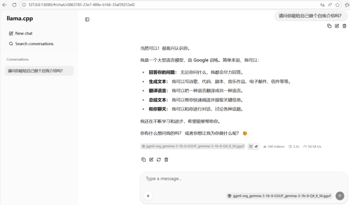 在准备好推理引擎与模型文件后,接下来我们将通过运行llama-server.exe并配置关键参数(如-m指定模型路径与-ngl 99开启全量 GPU 加速)来激活本地 AI 服务。在建立起一个兼容 OpenAI API 规范的高性能推理接口的同时,可在浏览器中通过http://127.0.0.1:8080访问可视化交互界面,正式开启与本地大模型的零延迟对话体验,如下图所示: