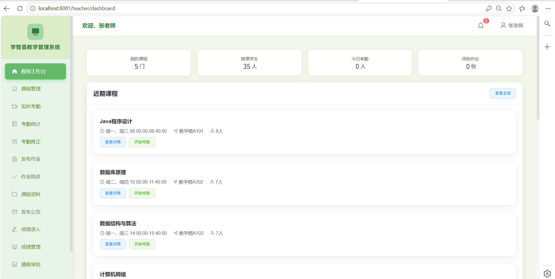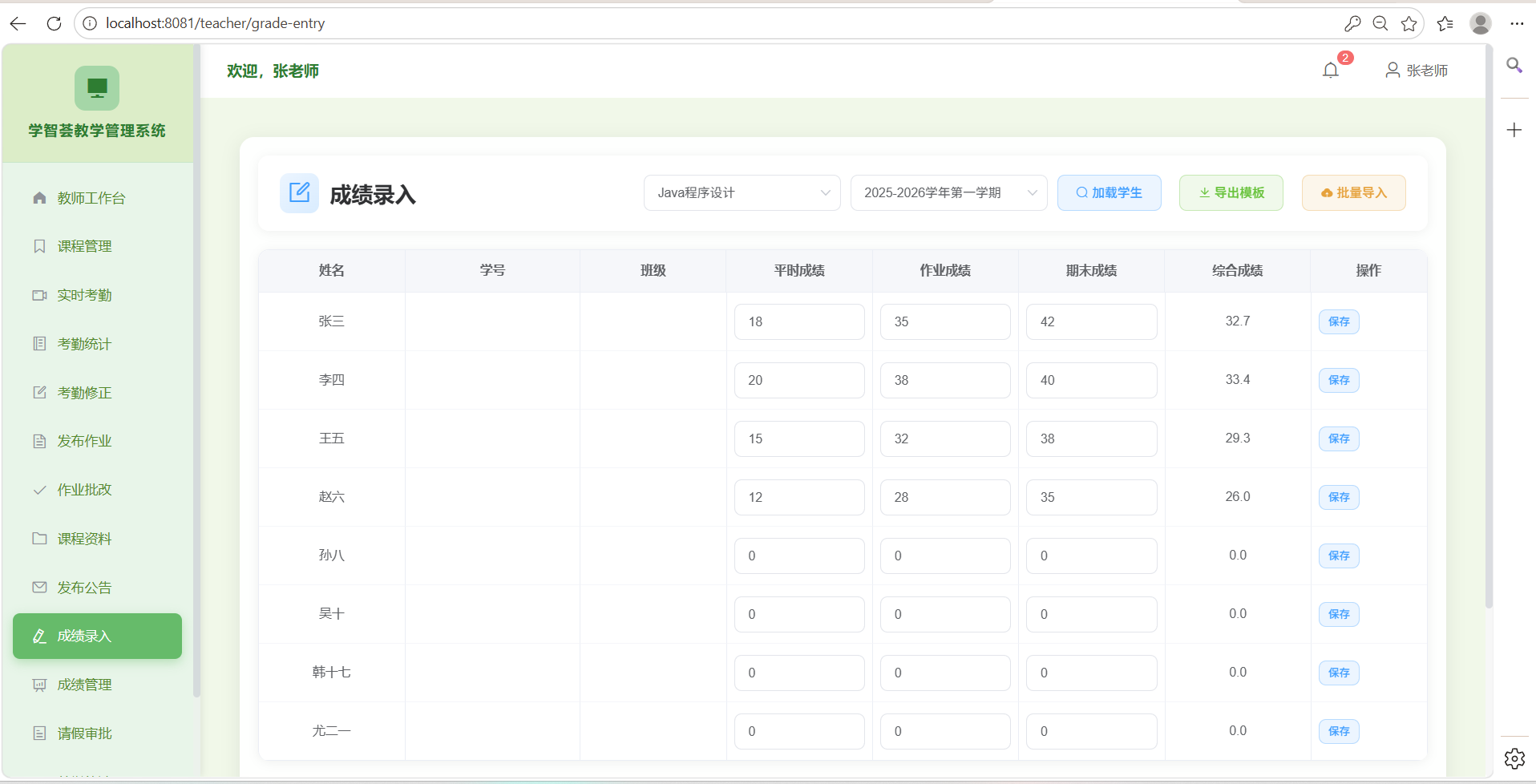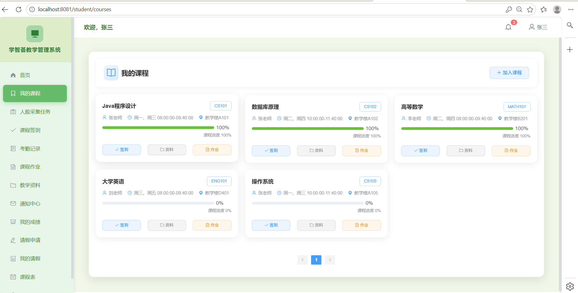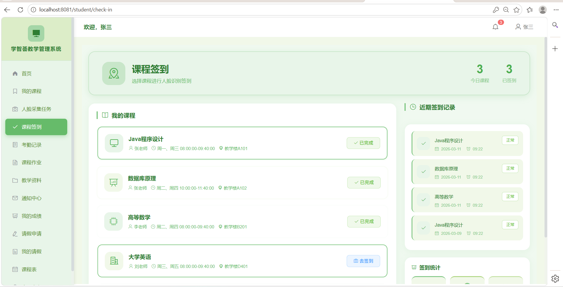 系统分为管理员、教师、学生三大角色模块。管理员模块包含用户管理、课程管理、考勤分析等功能。教师模块提供课程考勤、成绩管理、作业管理等功能。学生模块支持课程签到、作业提交、请假申请等功能。
