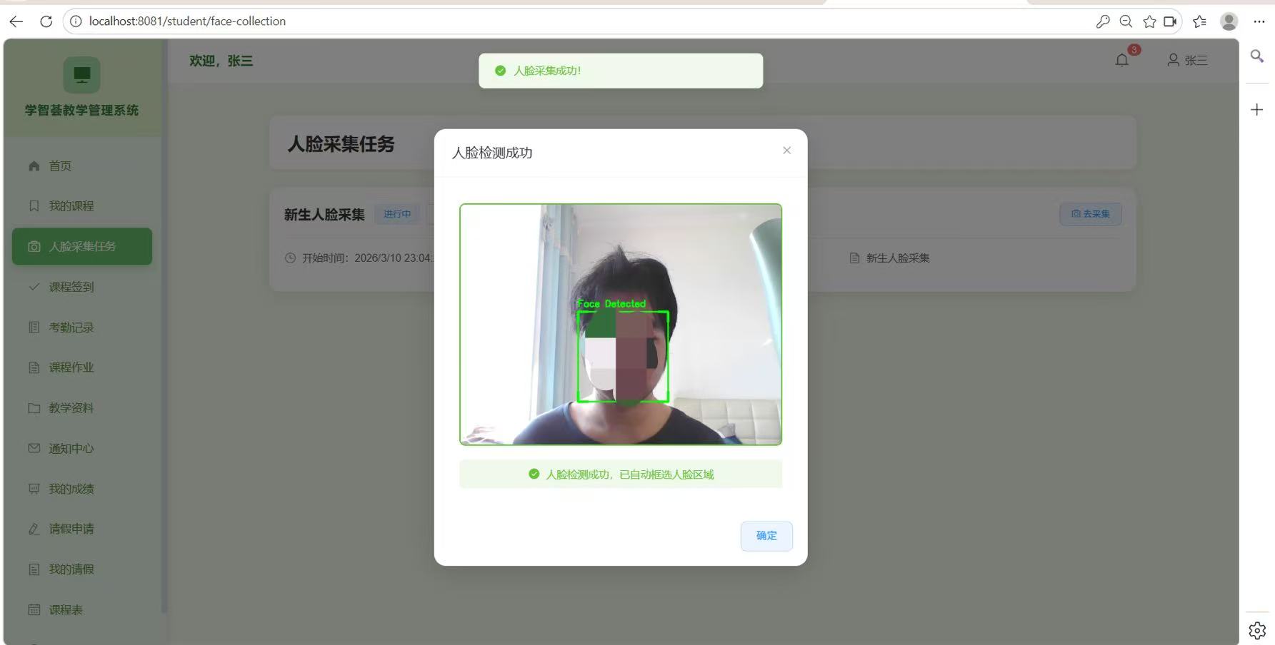 系统集成Flask人脸识别服务,支持电脑摄像头和ESP32-CAM硬件设备两种签到方式。人脸识别基于dlib模型,实现人脸采集、特征提取和匹配功能。考勤数据实时同步至主数据库,支持考勤统计与分析。
