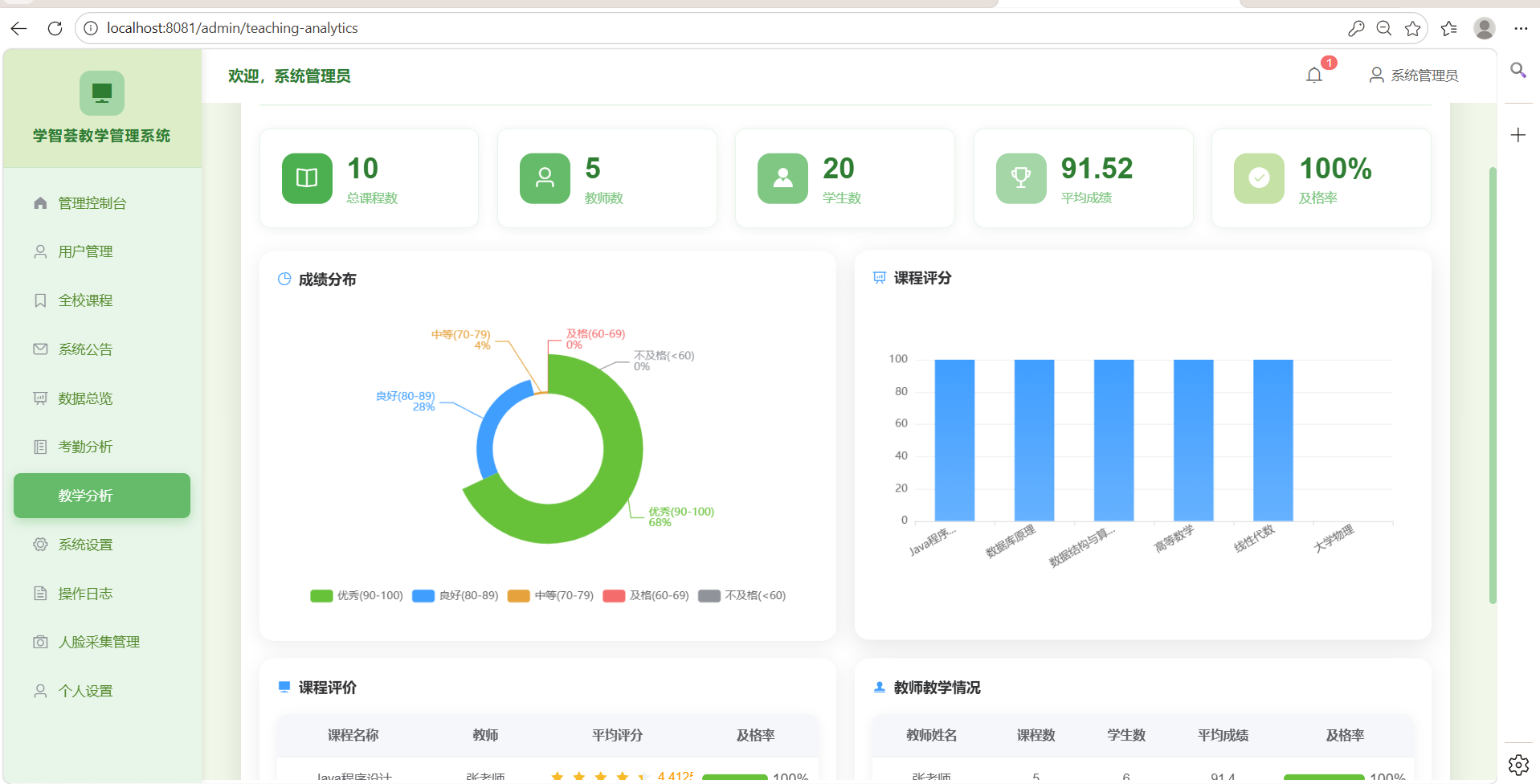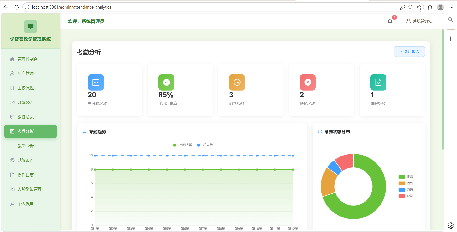 前端使用ECharts进行数据可视化展示,包括考勤统计、成绩分布等图表。后端提供数据分析接口,支持按课程、班级、时间等多维度查询,为教学决策提供数据支撑。