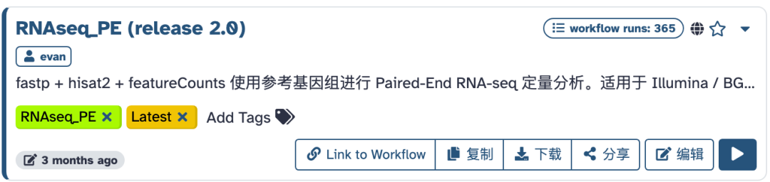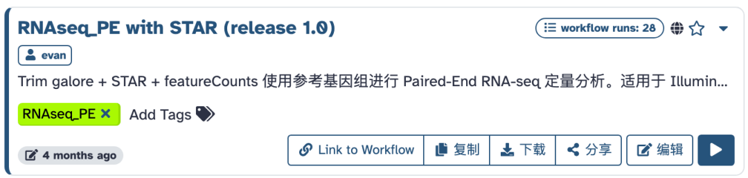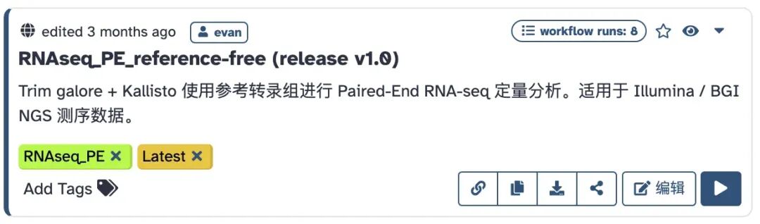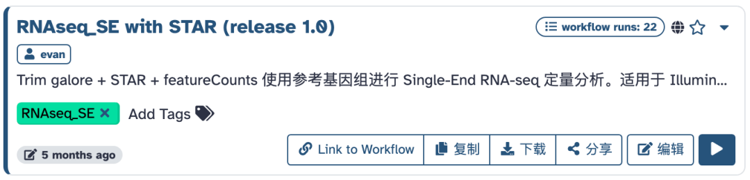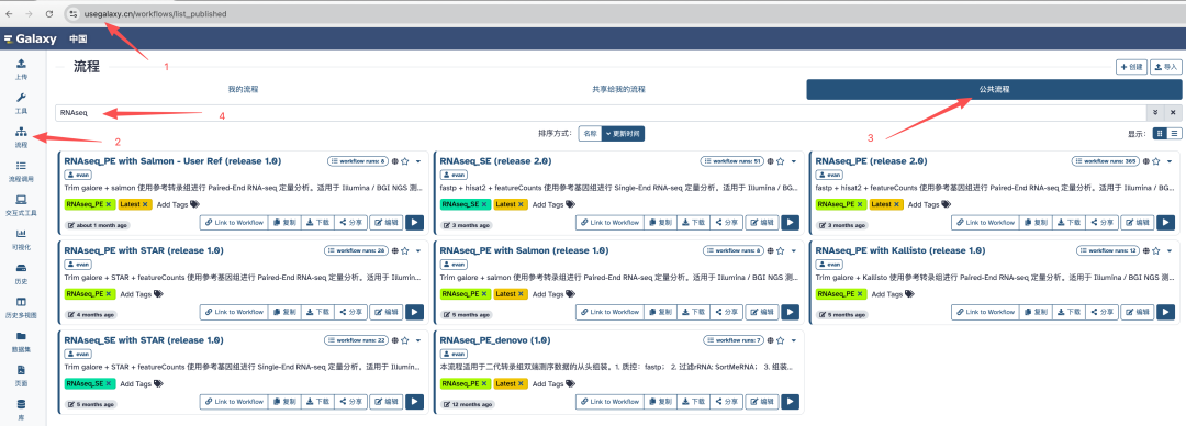 首先进入平台:https://usegalaxy.cn,找到"公共流程"页面,搜索:RNAseq,即可看到所有可用的转录组流程: