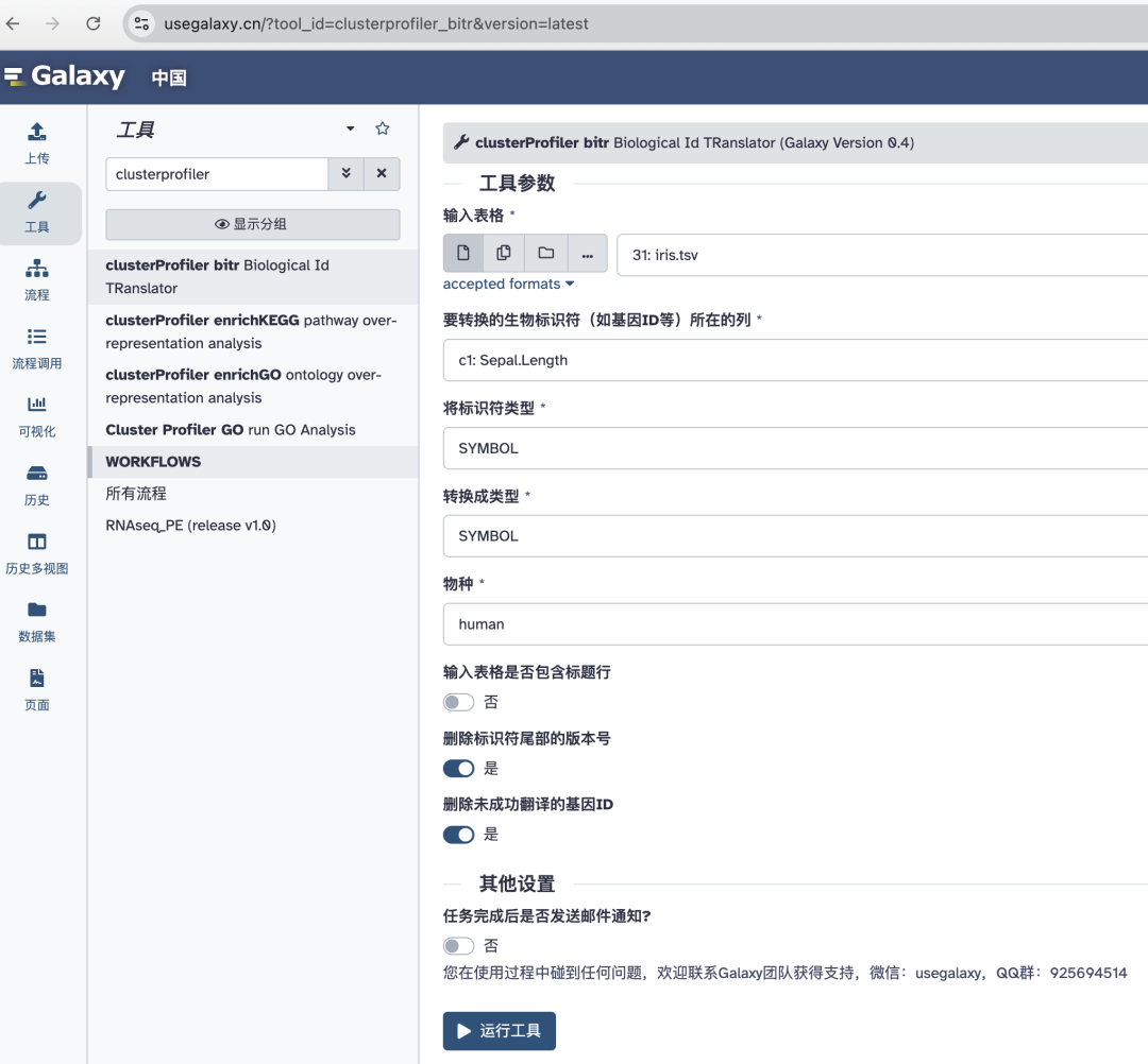 中国银河生信云平台(UseGalaxy.cn)致力于零代码生信分析。平台拥有海量计算资源、3000 多个生信工具和数十条生信流程,并且为用户提供 200G 免费存储空间。进群交流请先加 usegalaxy 为好友。