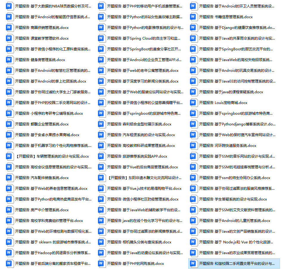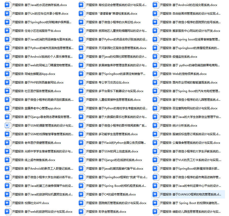 以上是某同学的毕业设计答辩的过程,如果你现在还没有参加答辩,还是开题阶段,已经选好了题目不知道怎么写开题报告,可以下面找找有没有自己符合自己题目的开题报告内容,列表中的开题报告都是往届真实的开题报告,可发送使用或参考。文末或底部来联xi可免费获取