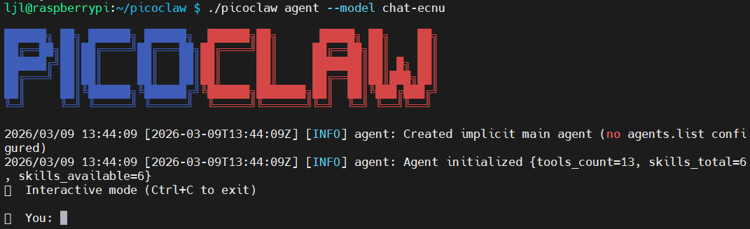 终端运行 ./picoclaw agent --model chat-ecnu 开启 CLI 对话模式;