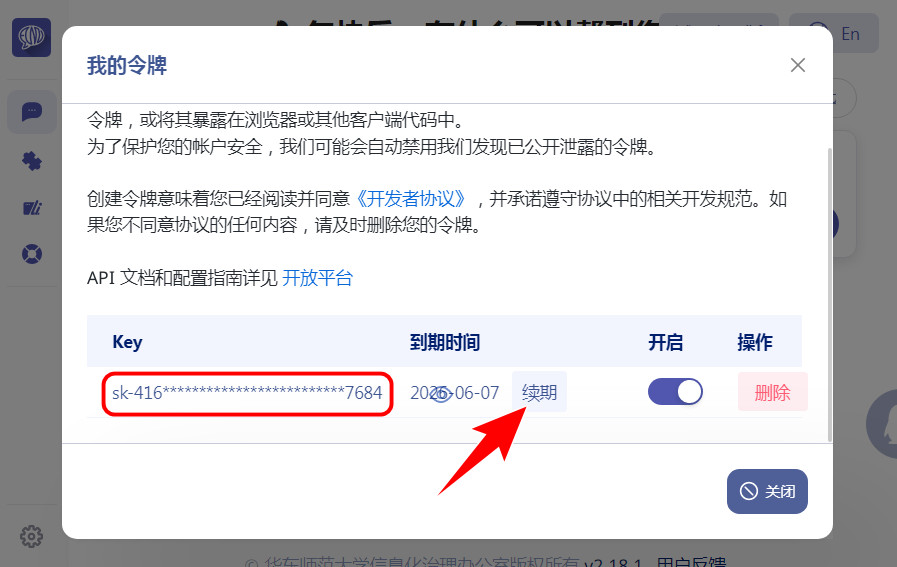 - 若之前未申请令牌,可按照 官方文档 的操作申请,复制并妥善保存 API-Key;