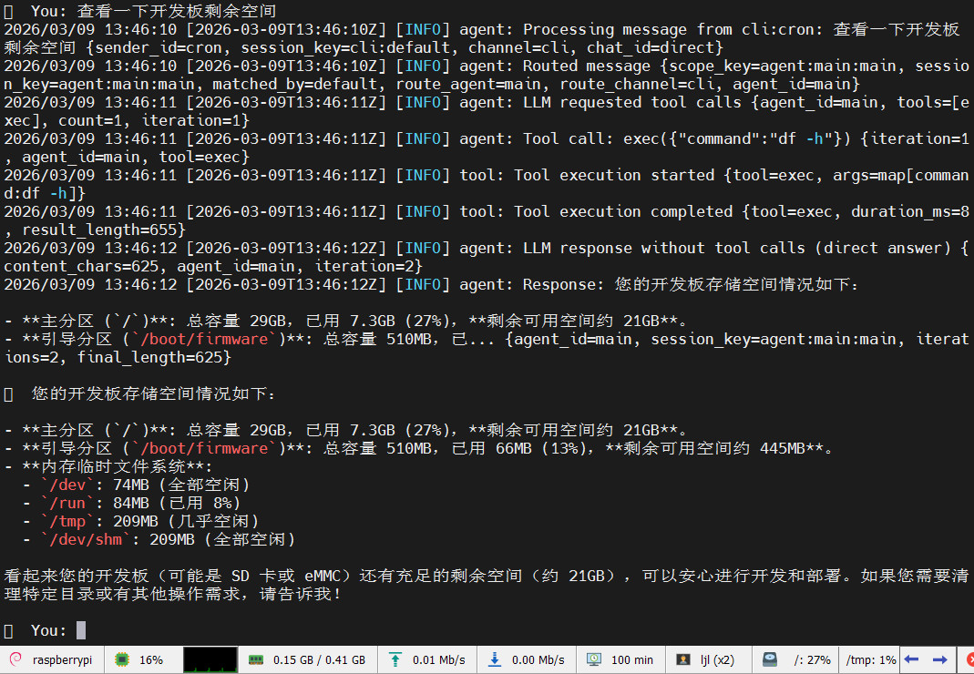 使用 PicoClaw 查询开发板空间使用情况,