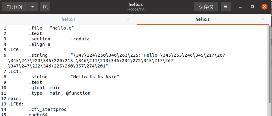 3)hello.s : 编译后得到的汇编语言文件
