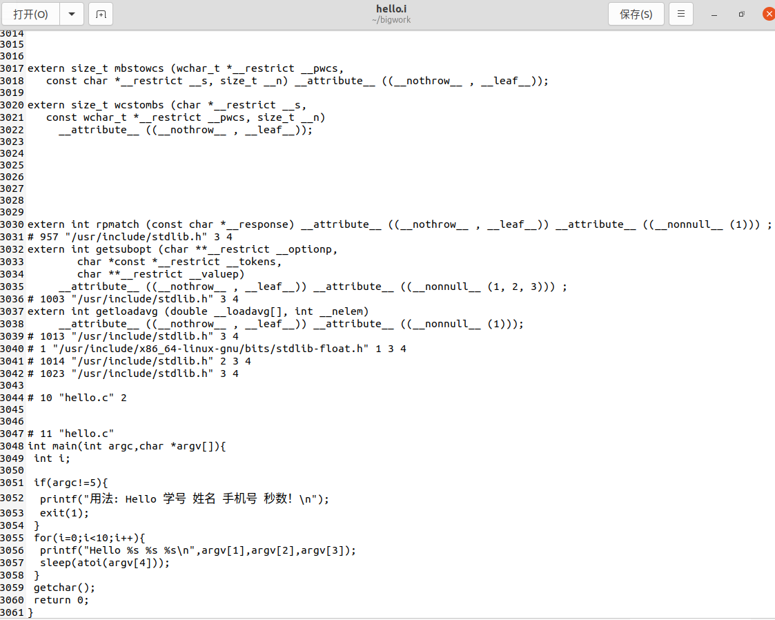 hello.i查看结果如上图,发现除了#部分被扩充后,程序的其他部分不变。在main函数前是stdio.h、unistd.h、stdlib.h的依次展开,第3044行# 10 "hello.c" 2是预处理的行标记,意思是从下一行开始的代码,来自hello.c文件的第 10 行。