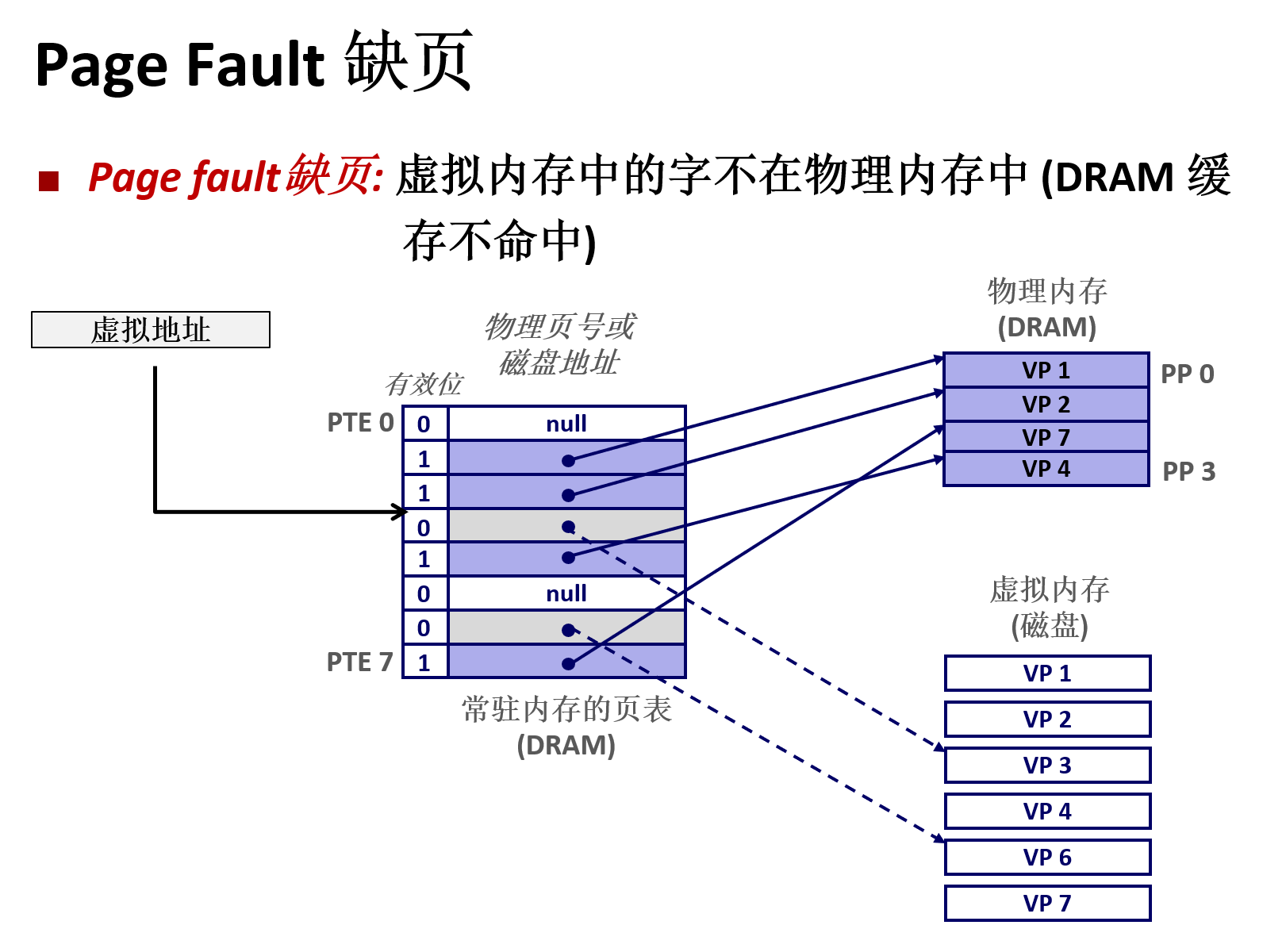 然后内核发起一个磁盘I/O请求,将所需的页面(VP3)从磁盘读入刚刚分配的物理页。此间,当前进程会被阻塞,切换到其他进程运行。当I/O完成后,内核修改当前进程的页表,更新对应的页表项,使其指向新的物理页,并设置存在位、权限位等。
