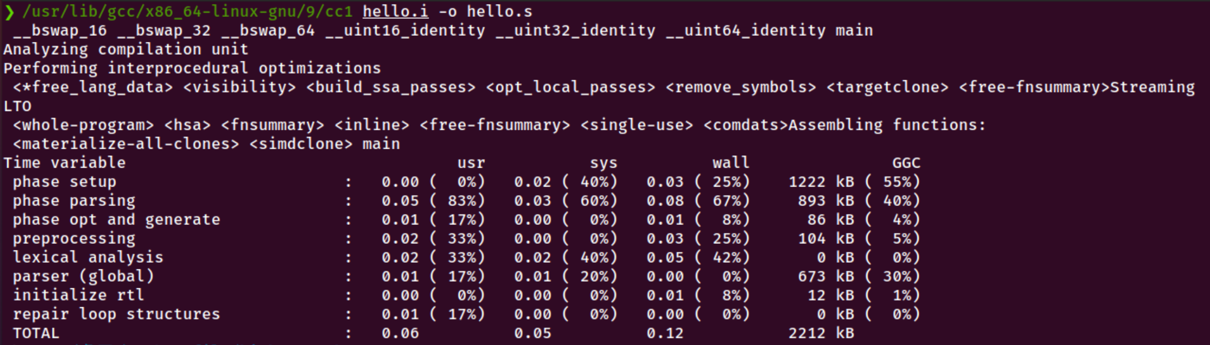 过程:编译器(cc1)对 hello.i 进行词法分析、语法分析、语义分析和优化,将其翻译成与特定 CPU 架构(如 x86-64)对应的汇编语言文件 hello.s。