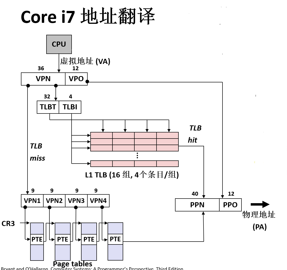 若不命中则会根据VA中的VPN和PTBR(页表基址寄存器)中的PTB(页表基址)在页表中寻找,一共分为四级页表,若能命中则PPN和PPO结合形成PA,之后同上;若不能命中则触发缺页故障,更新页表后再重新执行本条指令。