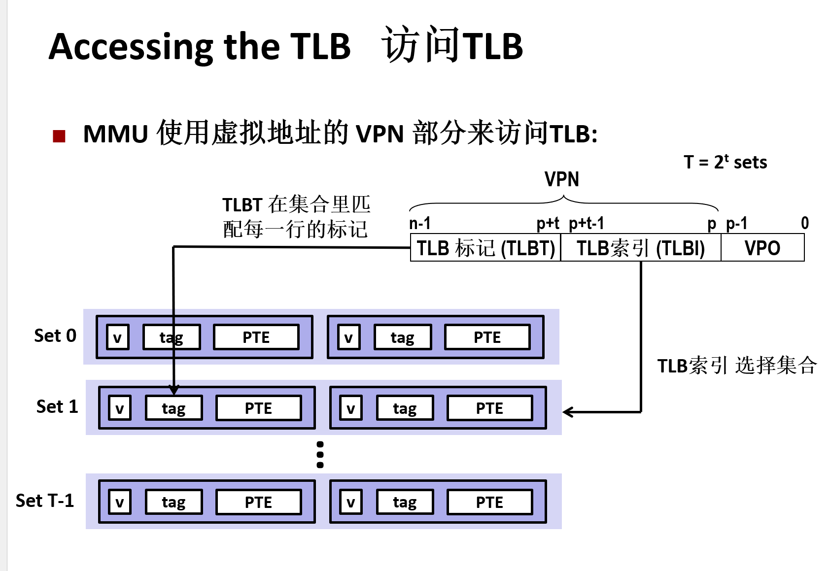 存储管理:OS与MMU(内存管理单元)协作加速地址转换和数据访问,输入VA(虚拟地址)后,根据VA中的VPN(虚拟页号)去TLB(快表)中查询PPN(物理页号)。