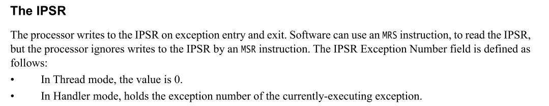 比如假设芯片的 UART 是 IRQ19,那么当 UART 中断触发时,IPSR 会被设置成 35(16 + 19 = 35)