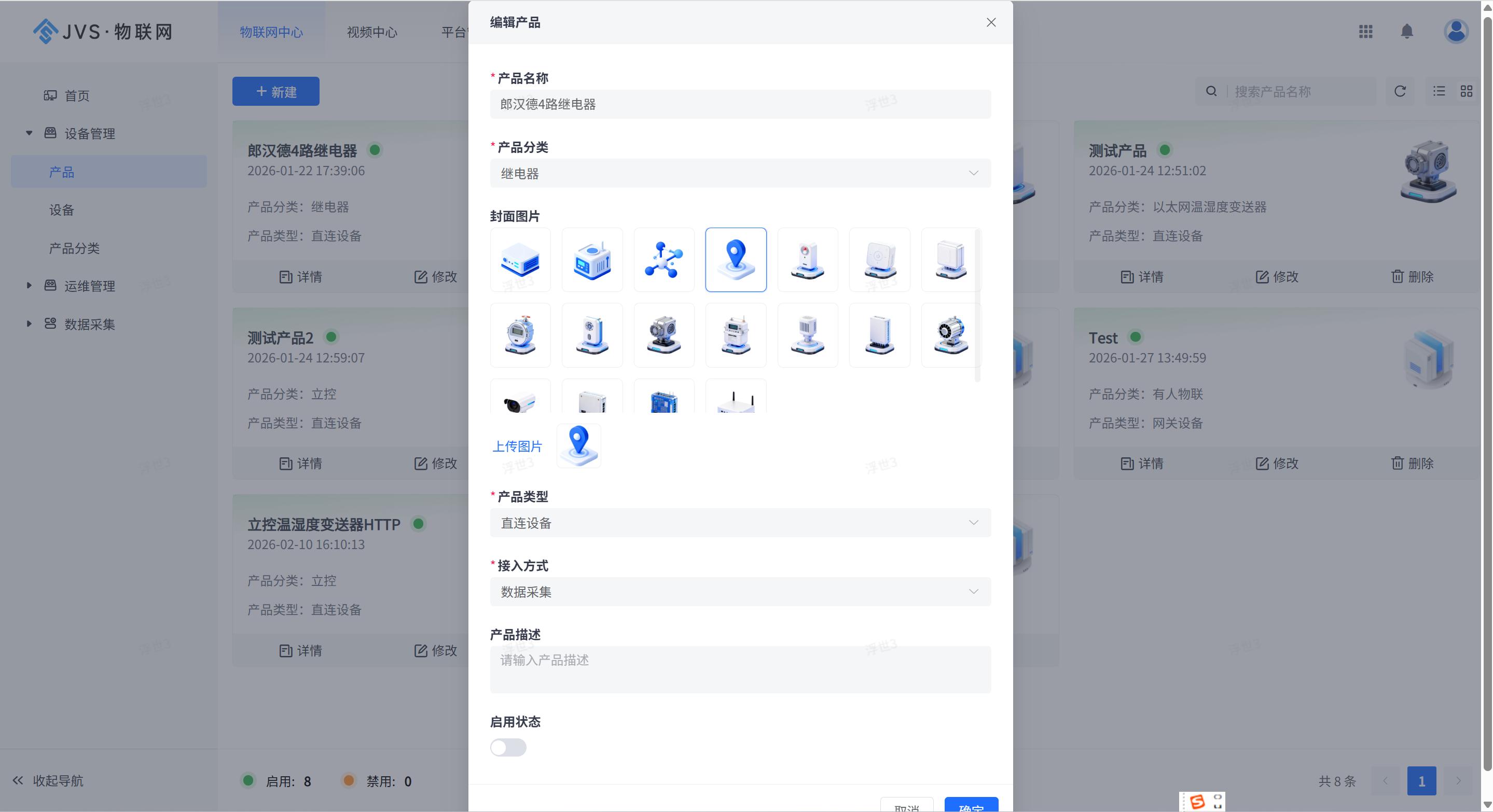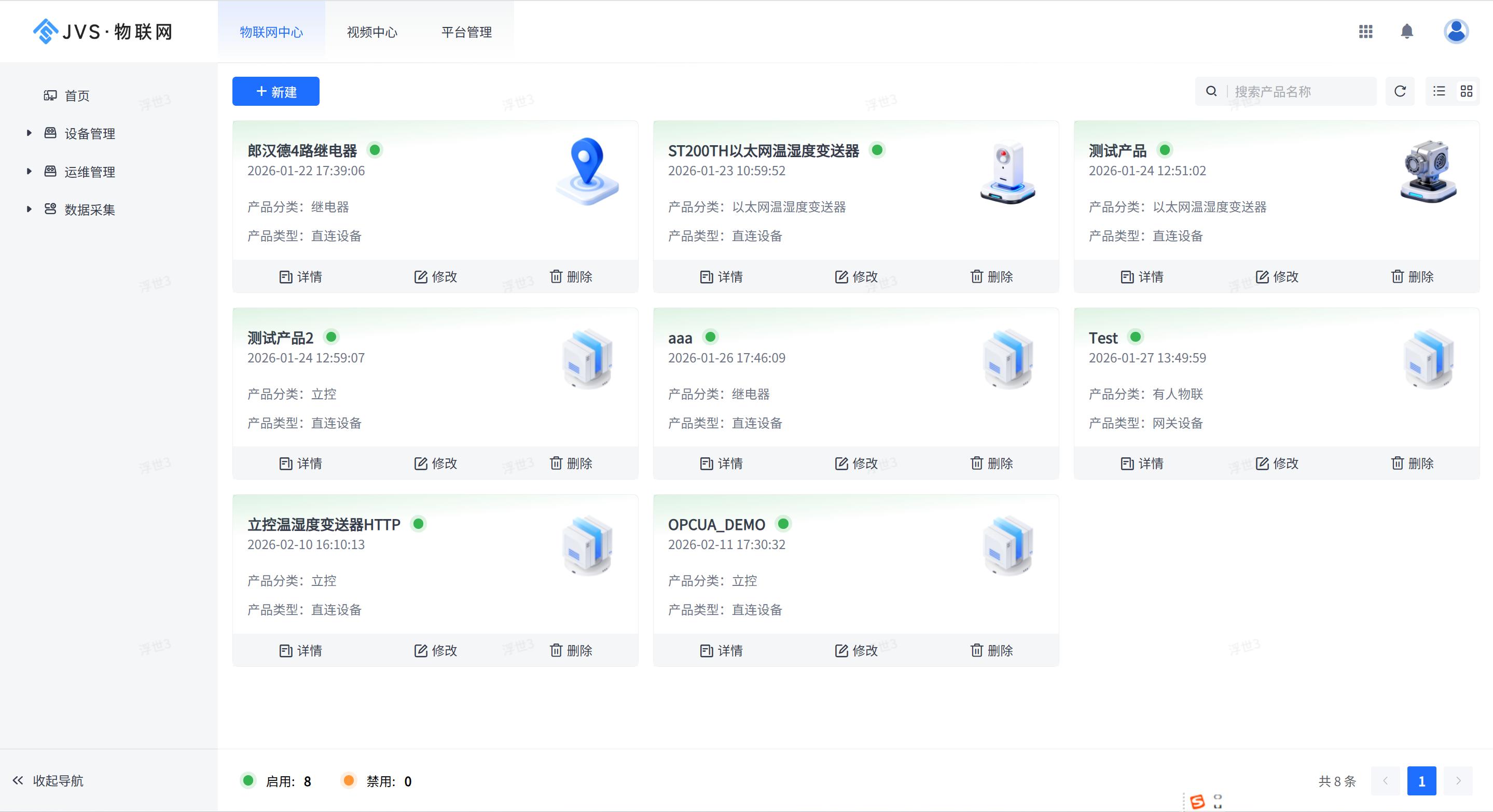 - 产品卡片:展示产品名称、启用状态、关联设备数量