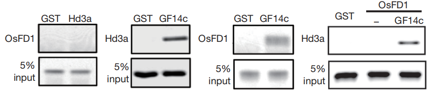 图6 GST pull-down分析(从左到右)GST-Hd3a与OsFD1,GST-GF14c与Hd3a,GST-GF14c与OsFD1,以及GST-OsFD1与Hd3a在有或没有GF14c的条件下的相互作用(Taoka et al., 2011)。