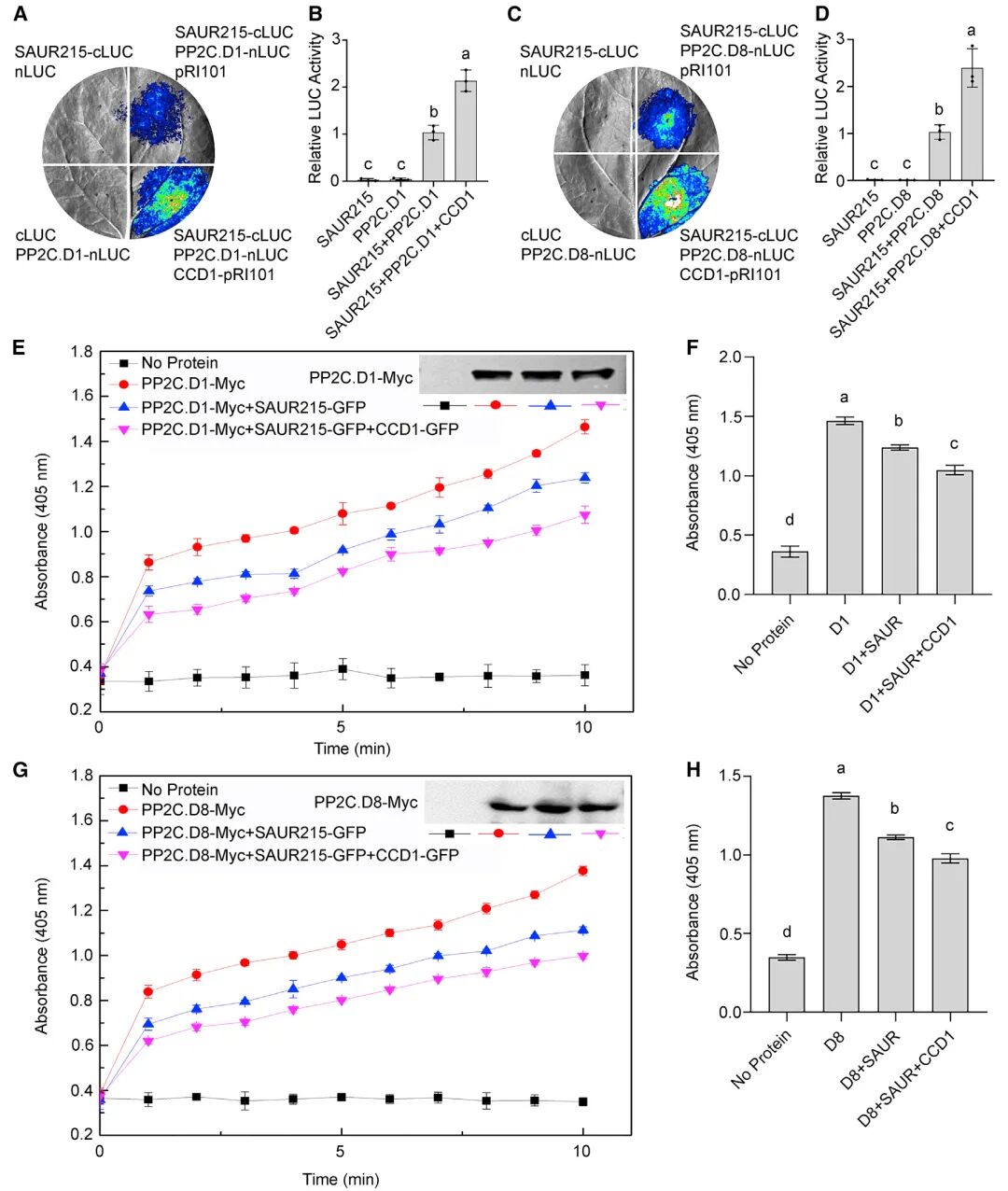 图8 TaCCD1增强了TaSAUR215与TaPP2C.D1/8的结合,并抑制了TaPP2C.D1/8磷酸酶活性(Cui et al., 2023)。(A)SLC实验表明TaCCD1促进TaSAUR215和TaPP2C.D1的结合。(B)不同载体组合的相对荧光素酶活性,使用(A)中平均颜色信号的强度计算。(C)SLC实验表明TaCCD1促进TaSAUR215和TaPP2C.D8的结合。(D)不同载体组合的相对荧光素酶活性,使用(C)中平均颜色信号的强度计算。(E和F)TaCCD1促进TaSAUR215(E)对TaPP2C1.D1磷酸酶活性的抑制,(F)显示反应结束时在405nm处的吸光度值。(G和H)TaCCD1促进TaSAUR215(G)对TaPP2C.D8磷酸酶活性的抑制,(H)显示反应结束时在405nm处的吸光度值。