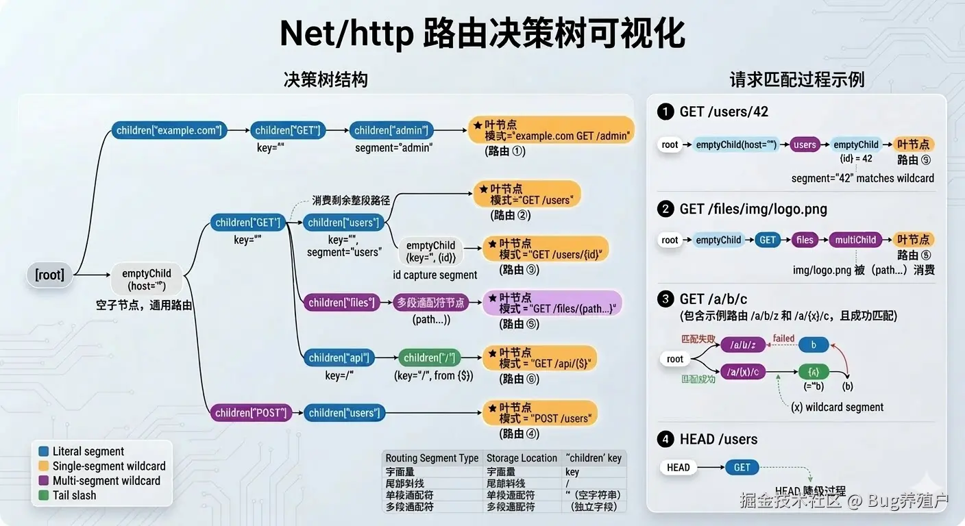 {id})--- 必须严格用{和}包裹,中间是通配符名。这里还细分了三种情况:{$}:精确匹配到路径末尾,后面不能再有任何路径段(相当于"必须完全到这里结束")。{name...}:贪婪多段通配符,只能放在路径最后,能匹配剩余所有路径段。{name}:普通单段通配符,只匹配一个路径段。