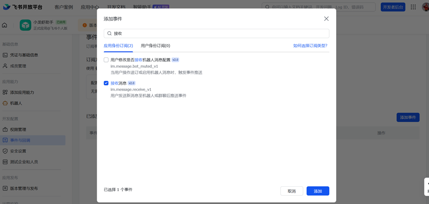 点击页面中的 "添加事件",在弹出的事件列表中,选择 "消息与群组" 分类,勾选 "接收消息",点击 "确定",完成事件订阅。