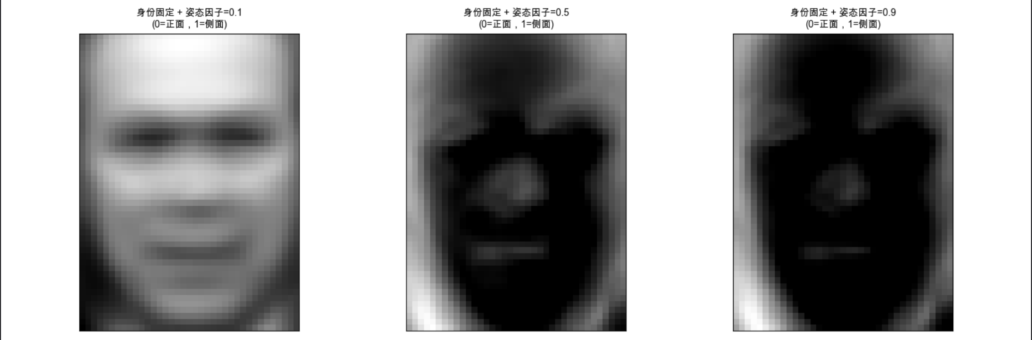 # 生成3种不同姿态的人脸(姿态因子从0→1,模拟从正面到侧面)