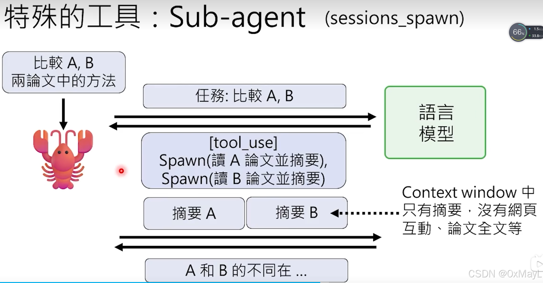- 最终将subagent的处理结果汇集给agent,用于完成最终的任务。