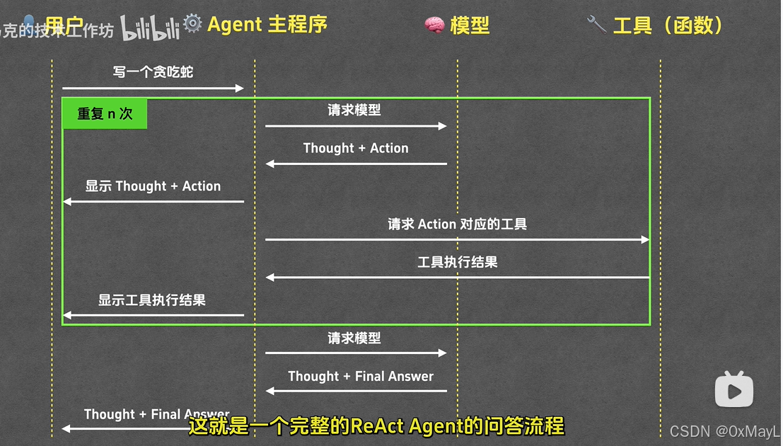 - 用户的提示词+思考过程+返回的结果都会被传入LLM作为上下文(堆叠上下文的方式),然后LLM又会输出新的执行。