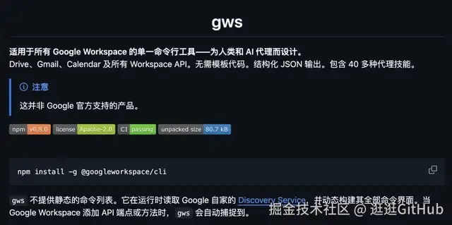 谷歌推出了一个开源项目 Google Workspace CLI(命令名 gws)。