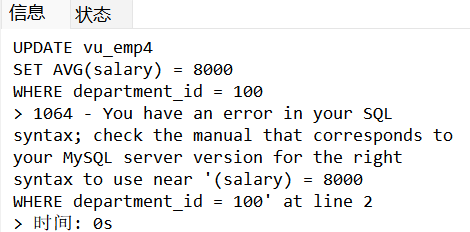 示例:上面我们创建了一个用于查询部门平均薪资的视图vu_emp4,如果对这个视图进行更新操作则行不通。