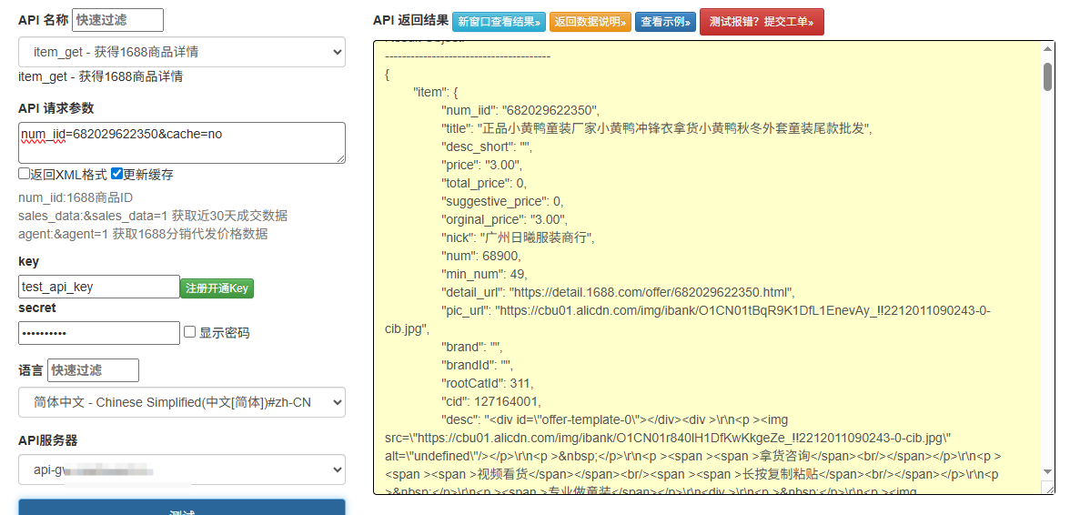 权限校验:对接前确认appkey已开通"商品详情查询"接口权限(登录1688开放平台,在"接口管理"中检查权限状态),若未开通,需提交申请并等待审核通过。