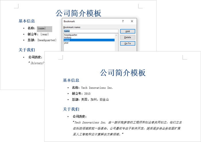 书签是Word文档自带的标记位置,可以在文档中固定一个位置,用于后续程序插入或修改内容。书签方式更适合复杂文档结构,例如表格、图表或多段落内容的插入。