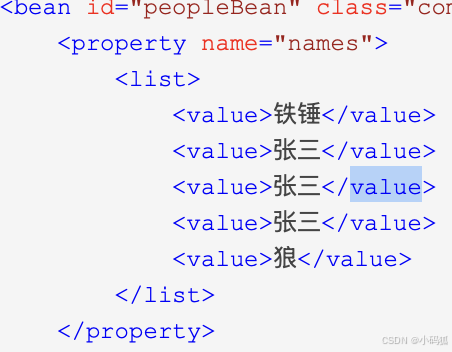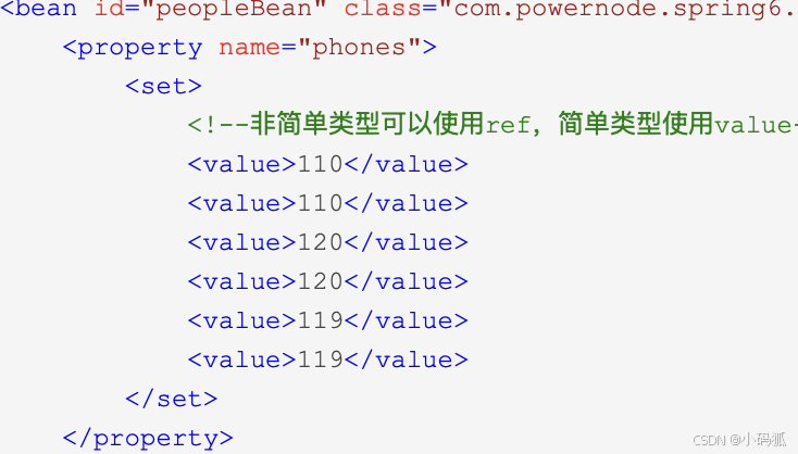 若属性是set集合 :使用set标签,set集合中元素是简单类型的使用value标签,反之使用ref标签。