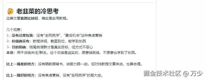 - 比上一篇差的地方:没有晒数据背书,说服力弱一些。但对纯教程文章来说,也算合理。