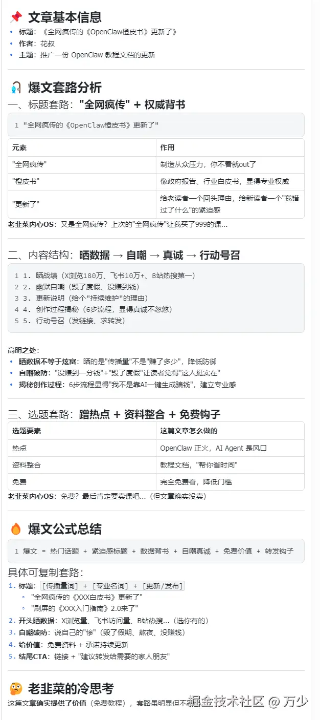 如果你也想写 OpenClaw 相关的文章,不妨参考一下花叔的"数据+自嘲"策略,或者坚持我的"干货+真诚"路线。 说不定你也可以参考这个思路,写出一个属于你的爆文分析 Agent!