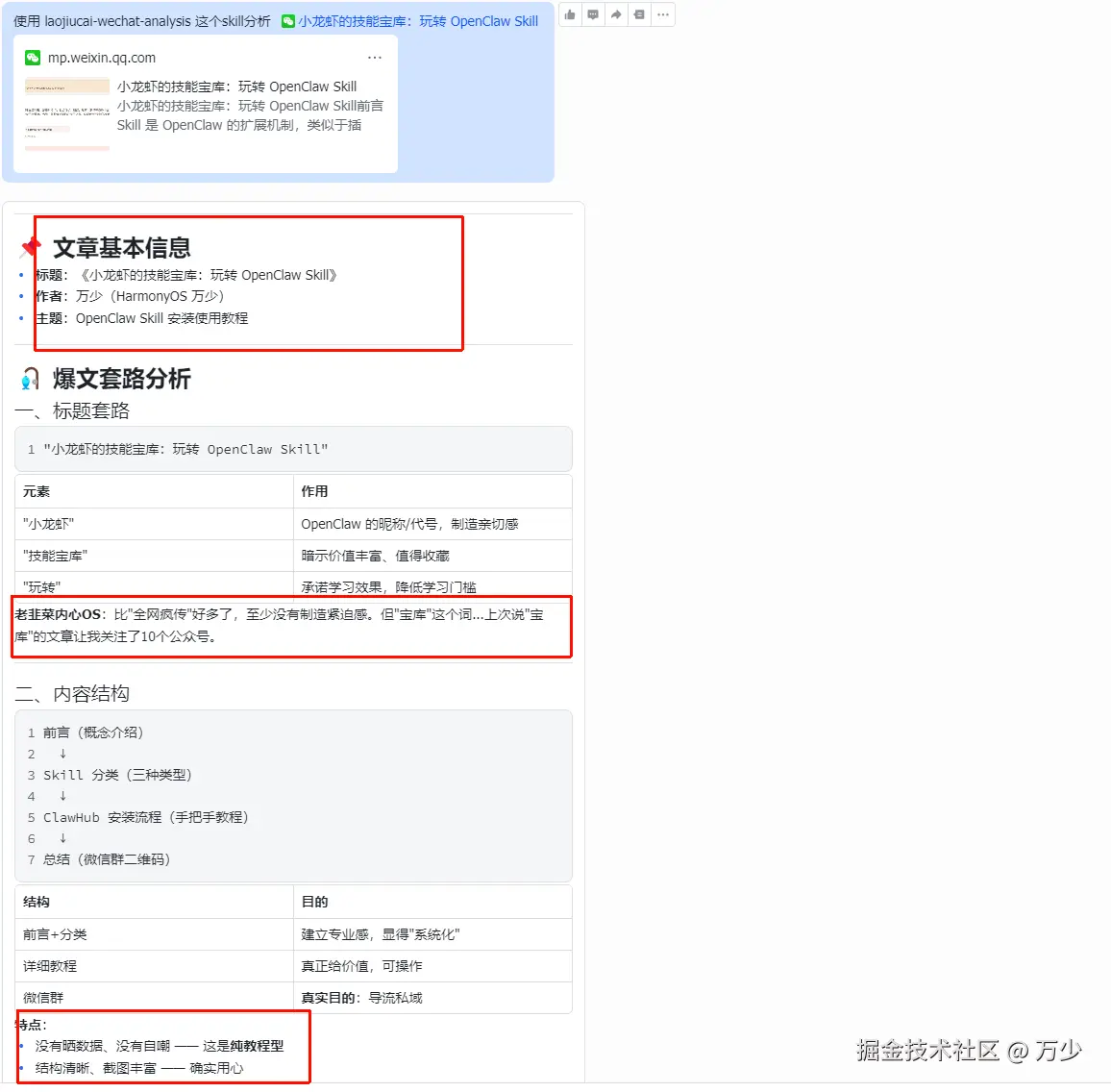 接着,我又用小龙虾分析了我自己写的文章《小龙虾的技能宝库:玩转 OpenClaw Skill》,看看和花叔的爆文比,差距在哪里。