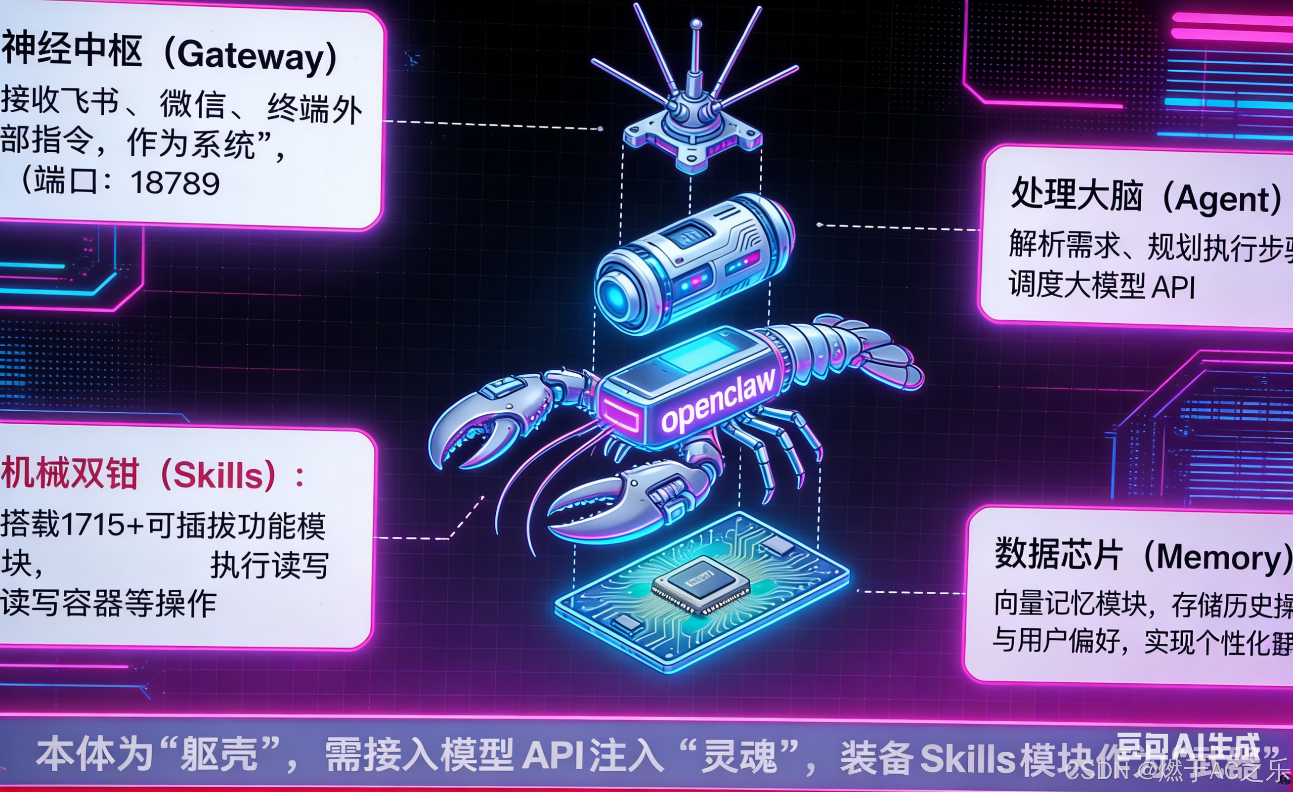 OpenClaw 是一个模块化的智能机器人框架,以神经中枢(Gateway) 统一接收外部指令,处理大脑(Agent) 负责需求解析与任务规划,并调度大模型 API。其机械双钳(Skills) 搭载了 1700 多个可插拔功能模块,能灵活执行读写等操作,而数据芯片(Memory) 则通过向量记忆实现个性化交互与历史偏好存储。