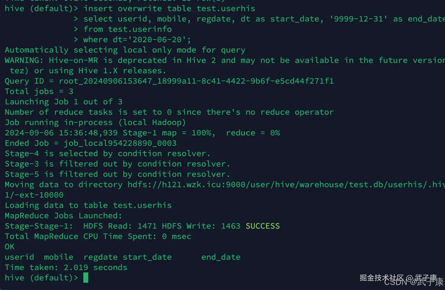 userinfo(分区表) => userid、mobile、regdate => 每日变更的数据(修改的+新增的)/ 历史数据(第一天) userhis(拉链表)=> 多个两个字段 start_date / end_date
