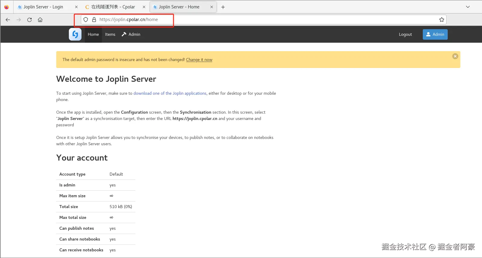 我们就成功在本地搭建了Joplin Server,但是想实现无需公网IP环境来远程访问Joplin Server里的数据库内容,就需要借助cpolar内网穿透工具来实现公网访问了!接下来介绍一下如何安装cpolar内网穿透并实现Joplin Server公网访问!
