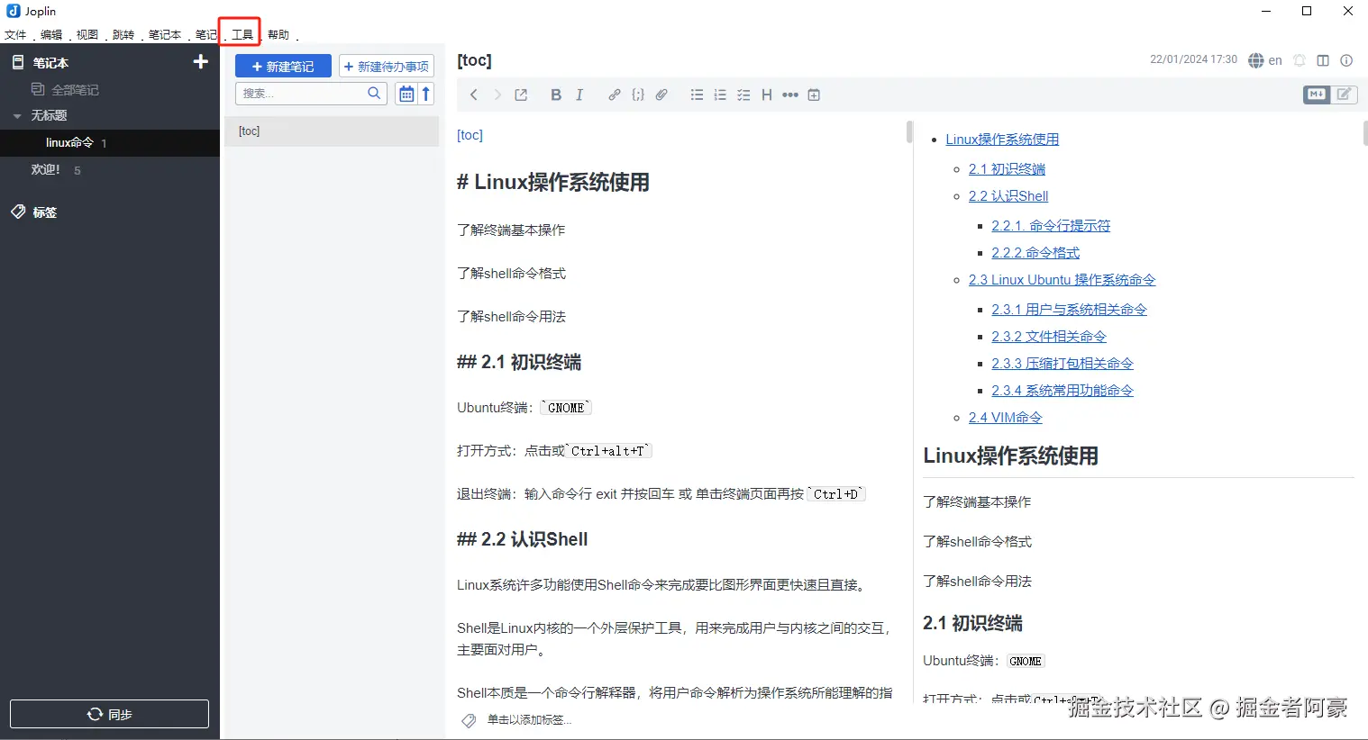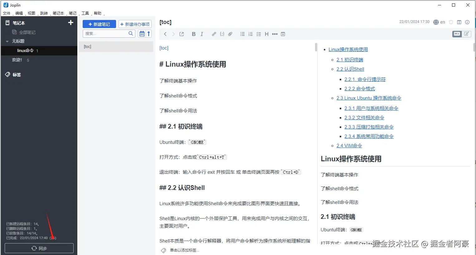 这个时候我们在客户端编辑完文章后,回到 Joplin主界面点击 同步