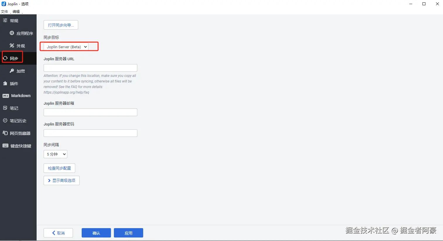在Joplin客户端中,点击上方工具,选择 选项,点击 同步,同步目标选择 JoplinServer,