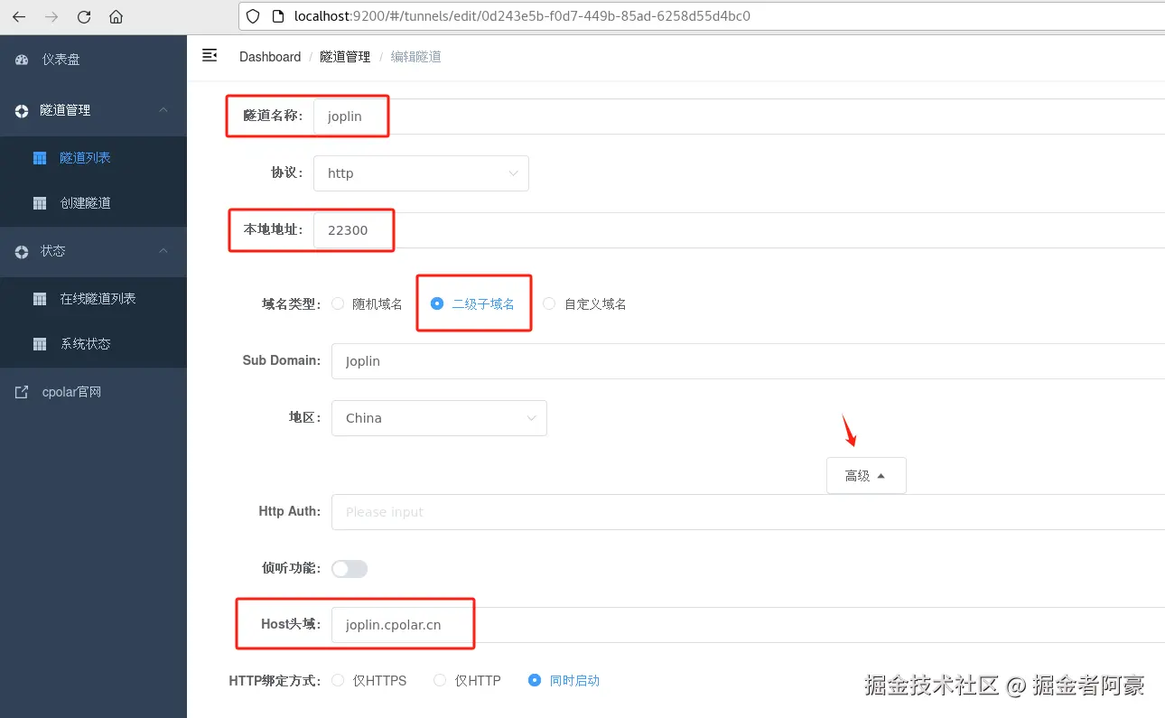 高级,选择Host头域 填写joplin.cpolar.cn