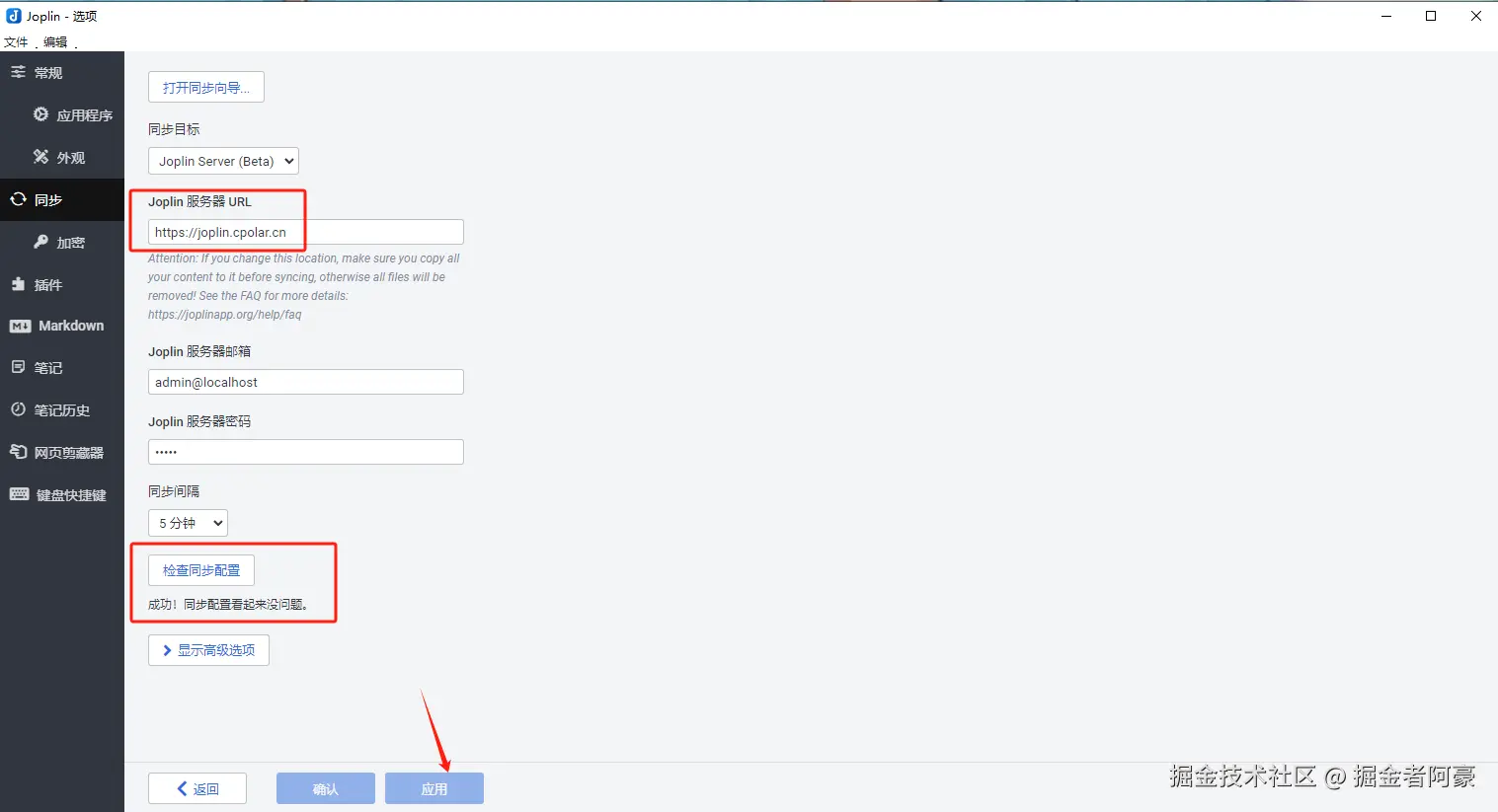 Joplin服务器URL:joplin.cpolar.cn Joplin服务器邮箱:选择admin@localhost或者在管理页面自行创建 Jpolin服务器密码:选择admin或者在管理页面自行创建 点"检查同步配置",显示"成功!同步配置看起来没问题"即可