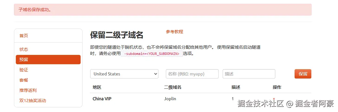 登录cpolar官网,点击左侧的预留,选择保留二级子域名,设置一个二级子域名名称,点击保留,保留成功后复制保留的二级子域名名称