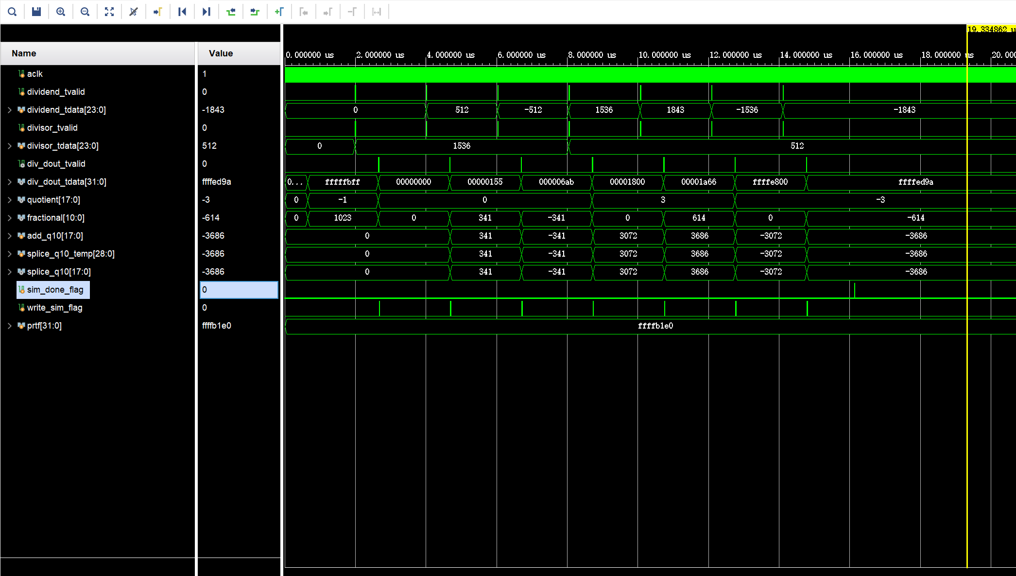 如下是两个有符号相除,采用符号位1位、整数位7位、小数位10位格式进行量化: