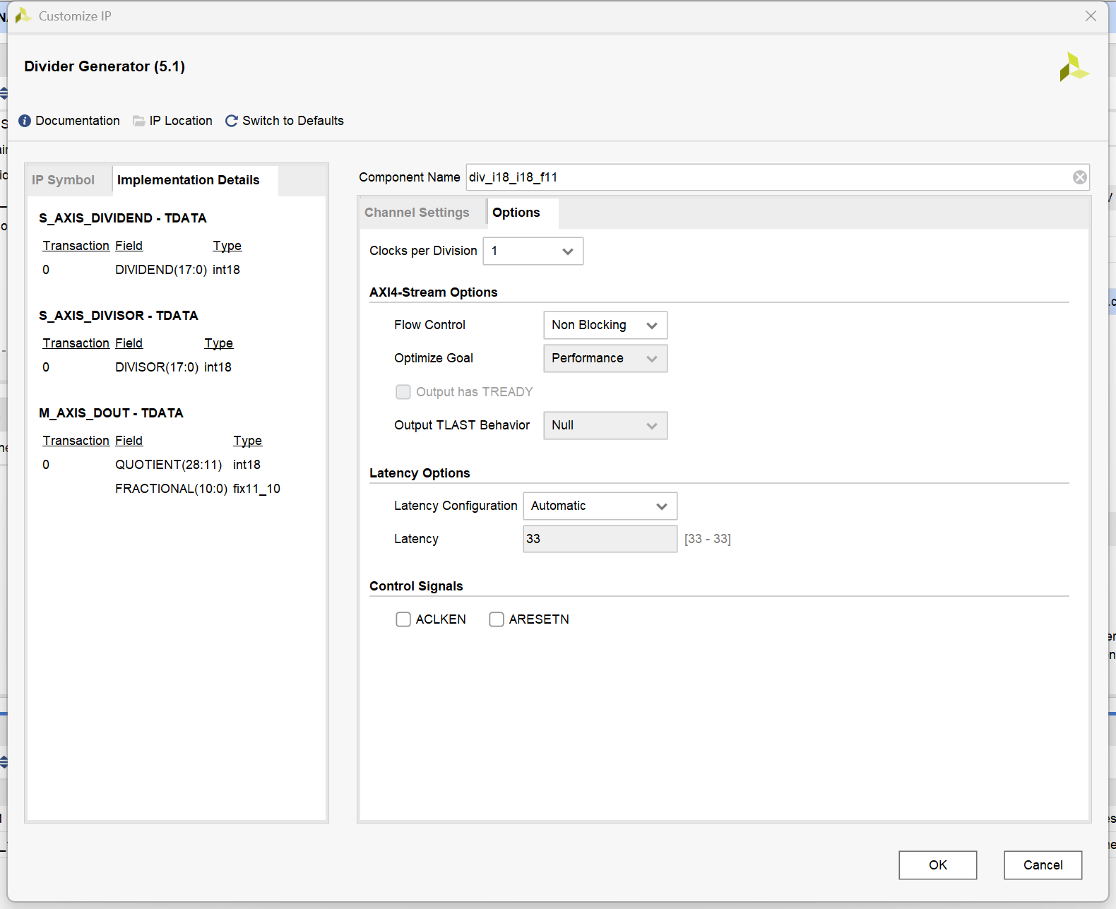 - 在工程中添加一个除法IP核,除数和被除数均为18位有符号数,输出小数保留11位,采用非阻塞时序。