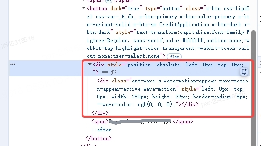 当用户点击按钮时,按钮内部会被动态插入一个带有 ant-wave 类的 <div> 元素,高度为 29px。这个元素的出现会导致按钮内的文字瞬间位移(上下跳动),然后随着动画结束又恢复原状。