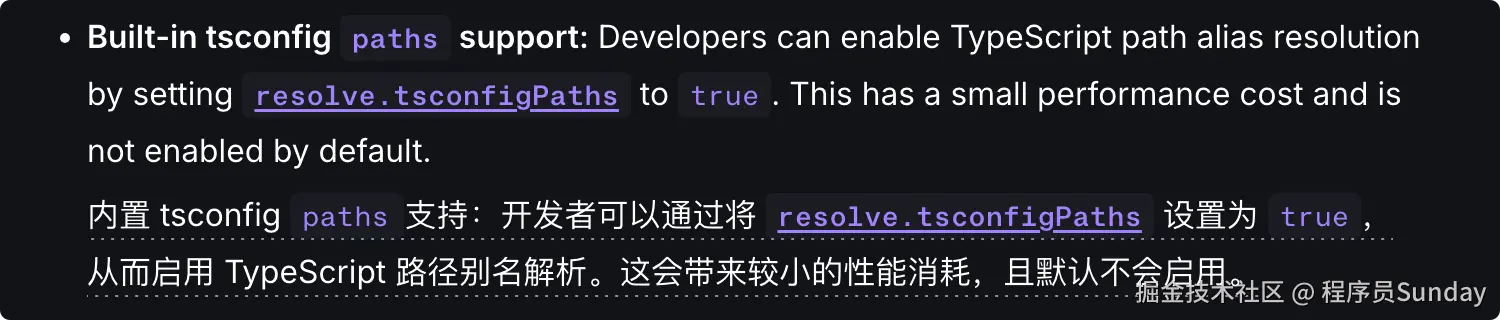 现在 Vite 8 提供了 resolve.tsconfigPaths,设为 true 就能直接读取 tsconfig.json 里的 paths 来解析别名。默认值是 false。
