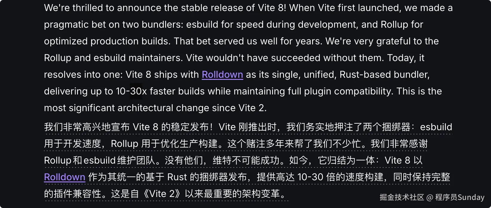 熟悉 Vite 的同学都知道,Vite 之前一直是 "开发走 esbuild、生产走 Rollup",这就导致生产环境下的打包非常慢,但是这次 vite8 的更新,全部统一成了 基于 Rolldown 的单一 Rust bundler 。官方给出的数据是,构建速度最高可达到 10~30 倍提升。