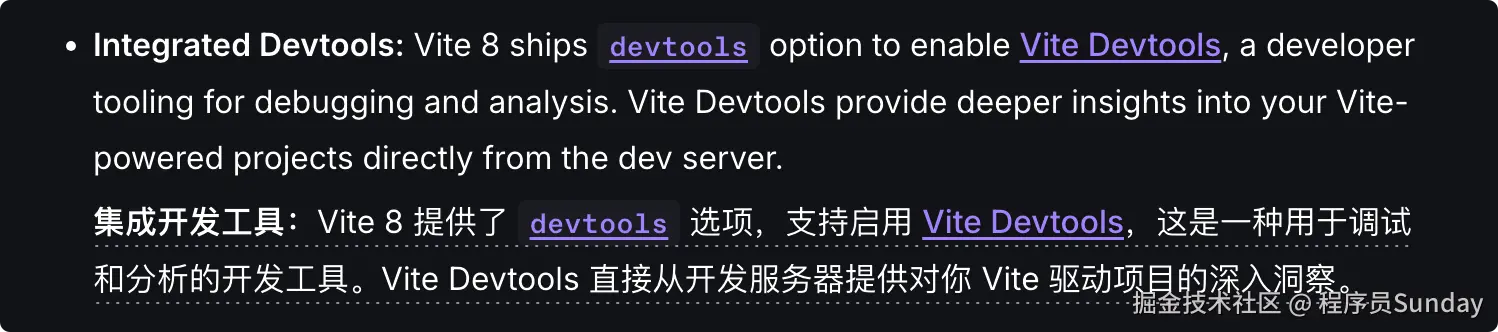 Vite 8 提供了 devtools 配置项,用来启用 Vite Devtools。官方文档里标注这项能力目前是 experimental ,默认关闭,而且当前只支持 build mode。