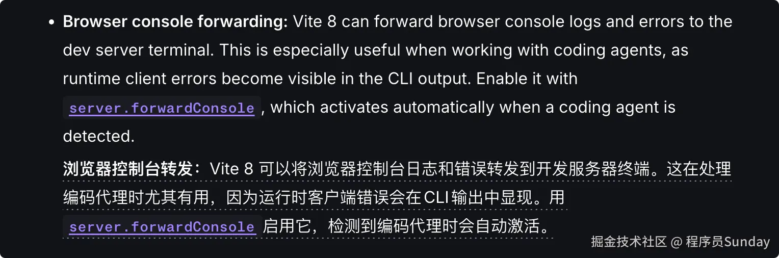 Vite 8 新增了 server.forwardConsole,可以把浏览器运行时的 console 日志和未处理错误,直接转发到 Vite 服务端终端。