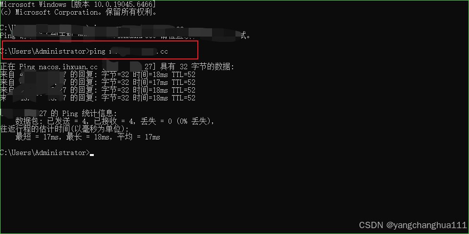 等待几分钟,打开cmd, ping 刚才的域名,如果返回的是nacos的ip那说明解析成功了